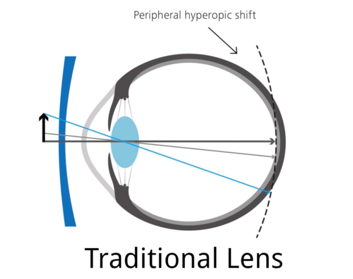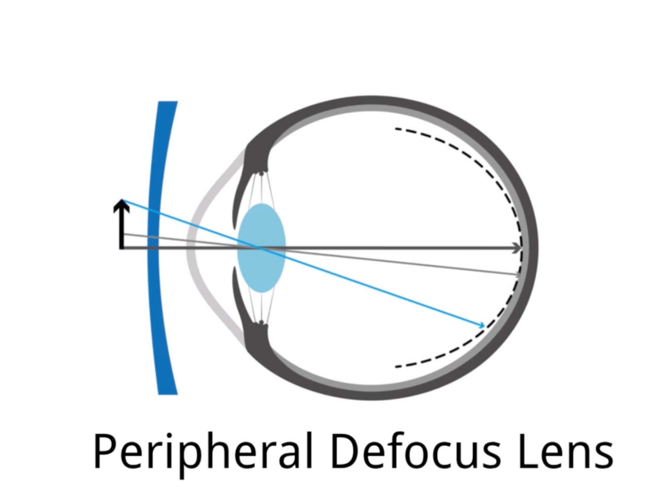 創新的「周邊離焦」鏡片,讓中央區域有視力清楚的足夠度數,周邊區域漸層降低度數,甚至沒有度數,圖中虛線是成像聚焦之處,避免了上述問題,甚至讓視網膜周邊的區域呈現近視模糊狀態(類似度數不足),反而可能使眼球縮短(眼球內縮讓視網膜去貼近成像),進而逆轉近視。